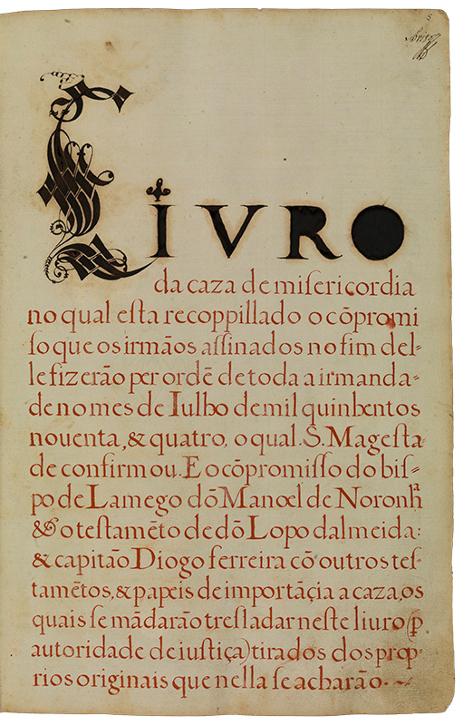 Livro da casa de Misericórdia no qual está recopilado o compromisso que os irmãos assinados no fim dele fizeram, por ordem de toda a irmandade, no mês de julho de mil quinhentos e noventa e quatro, o qual Sua Majestade confirmou; e o compromisso do bispo de Lamego, D. Manuel de Noronha, o testamento de D. Lopo de Almeida e do capitão Diogo Ferreira com outros testamentos e papéis de importância à casa, os quais se mandaram tresladar neste livro (por autoridade de justiça) tirados dos próprios originais que nela se acharam.